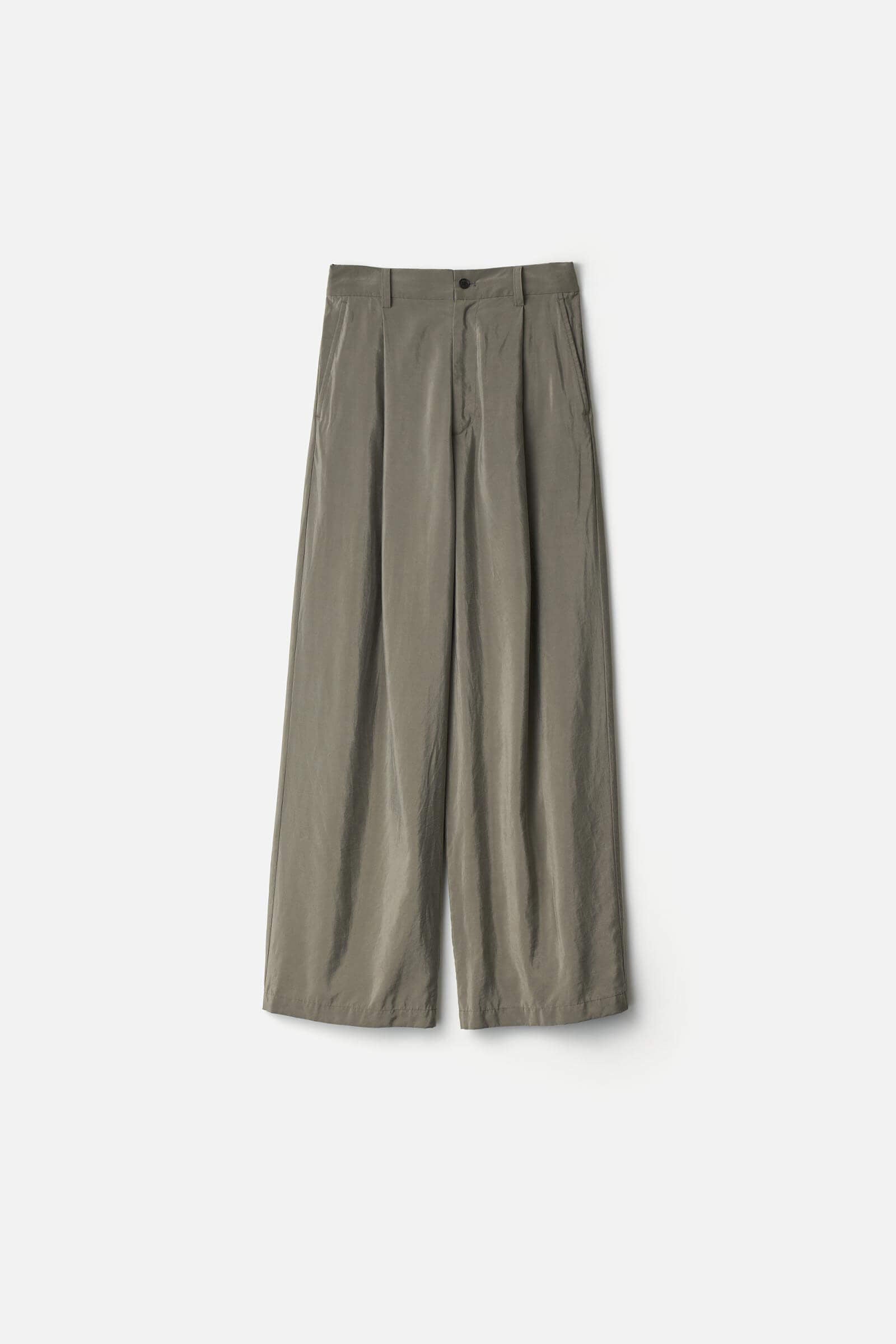 One tuck easy trousers crafted from original silk nylon fabric with a peach touch finish, achieved through sand washing after dyeing and utilizing the fibrillation of the silk yarn. The silhouette is a relaxed wide straight fit with a subtle taper toward the hem. Puckering after garment dyeing and subtle texture of the fabric add further character.