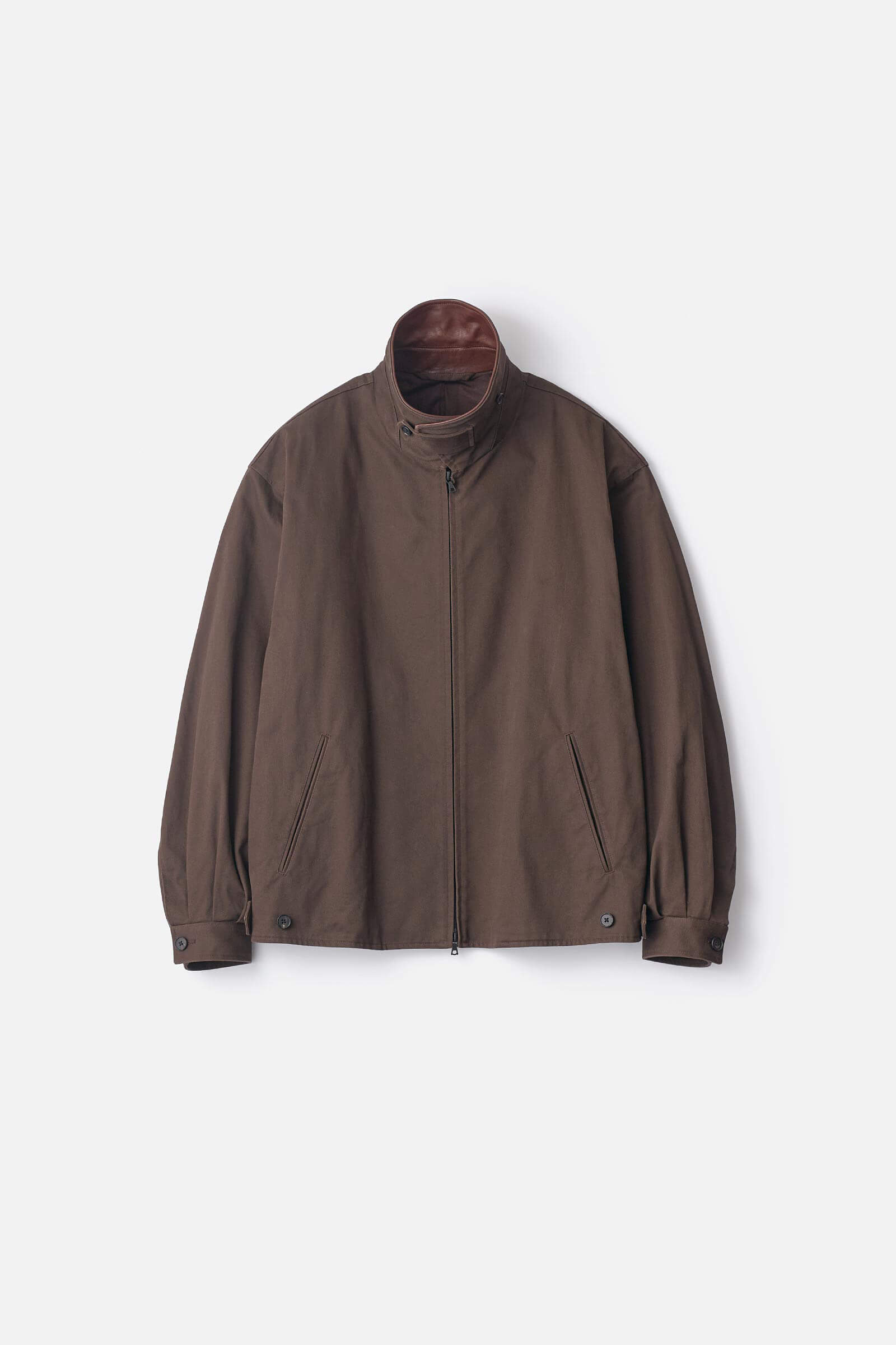 Zip jacket made from thick 16×10 chino fabric with a slightly brushed finish. Overall minimal impression, with subtle nuances added by cow leather on the collar and an extended tab at the hem. Sulfur-dyeing and light brushing proceess give the fabric a suede-like texture that develops more character with washing.
