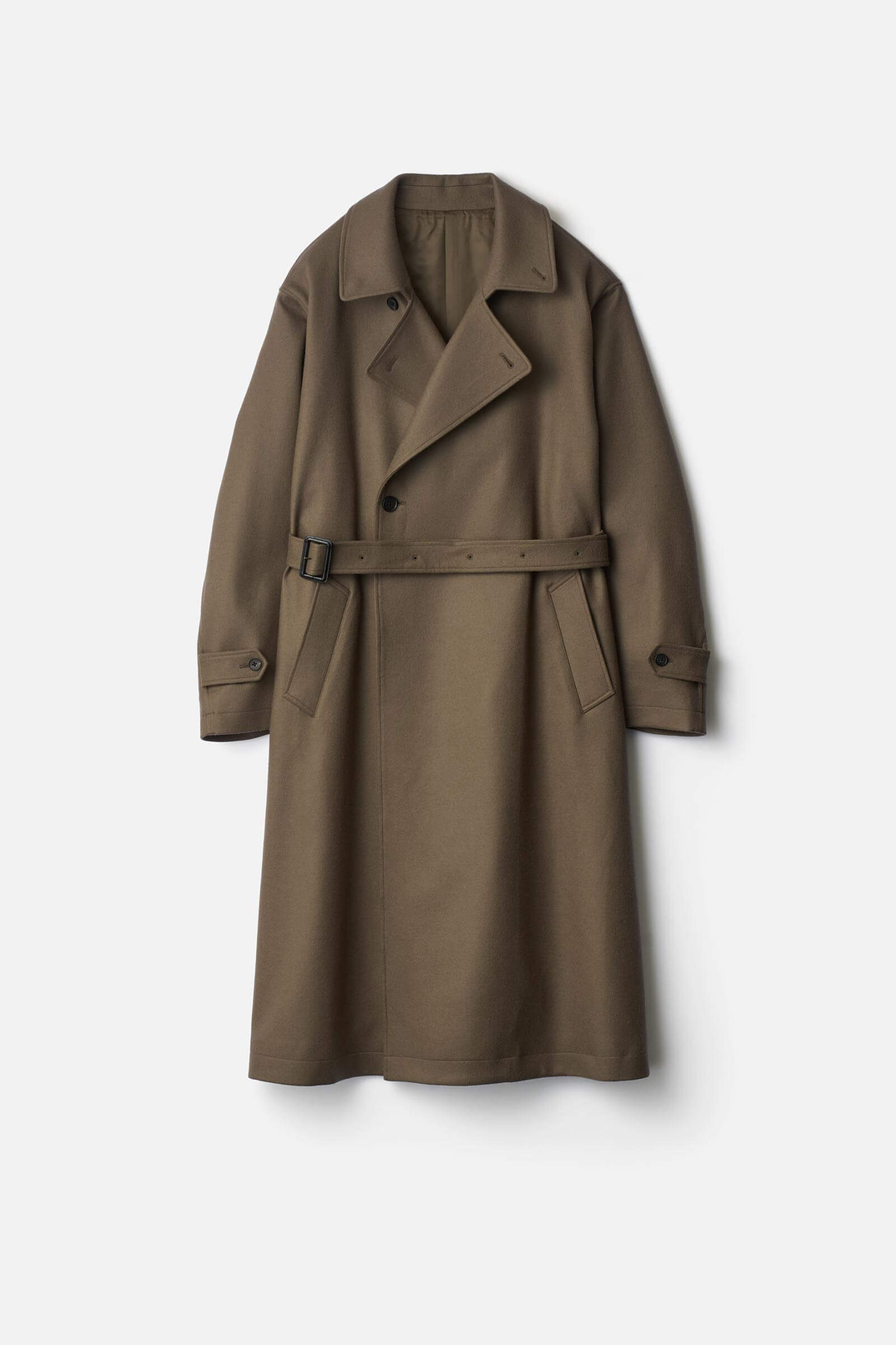 Double breasted coat crafted from double weave melton made with Super 120’s 2/90 worsted wool, featuring a refined surface and subtle luster by reducing fuzzienss during the finishing process. Using worsted instead of woolen yarns enhances the fabric’s smoothness and brings out its beautifully fine texture. The leather drawstring at the waist can be worn concealed inside or adjusted externally for styling versatility.
