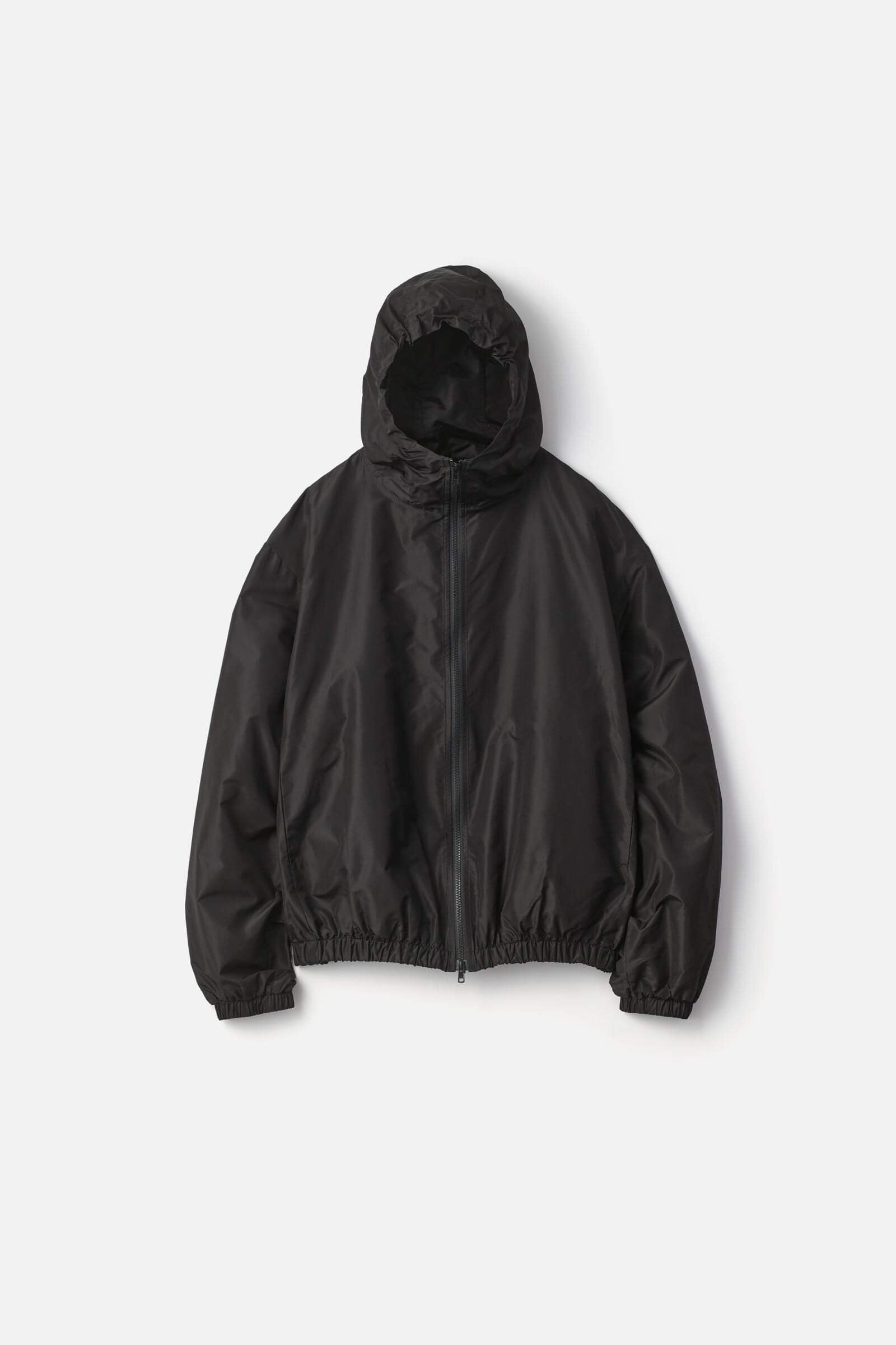 タテヨコ共にブラタク社のフィラメントシルクの高密度タフタで製作した、肩幅・身幅をたっぷりとり、着丈を短く設定したショート丈フードジャケット。