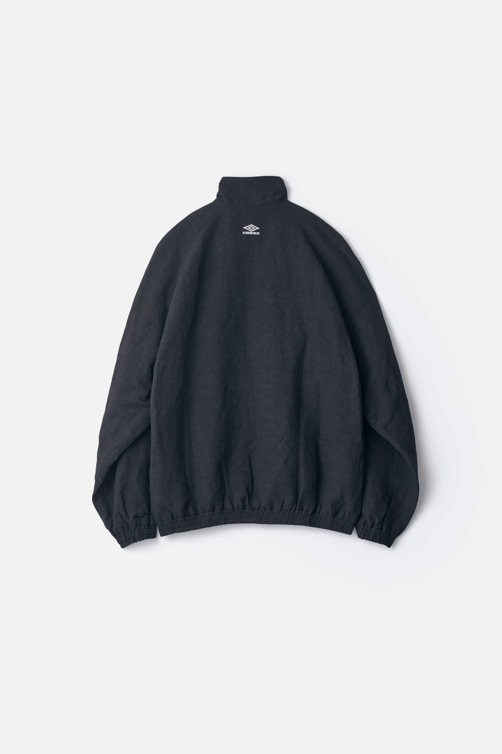 洗い加工を入れコシを抜かした後、撥水加工を施すことで生まれる表面感、適度なハリ感が特徴のリネンxナイロンの交織素材で製作したトラックジャケット。スポンジライクなナイロン糸とハリの強いリネンを交織したことによる独特なぬめりのある生地感も特徴。左胸、ネック後ろ部分にUMBROのロゴが入る。
