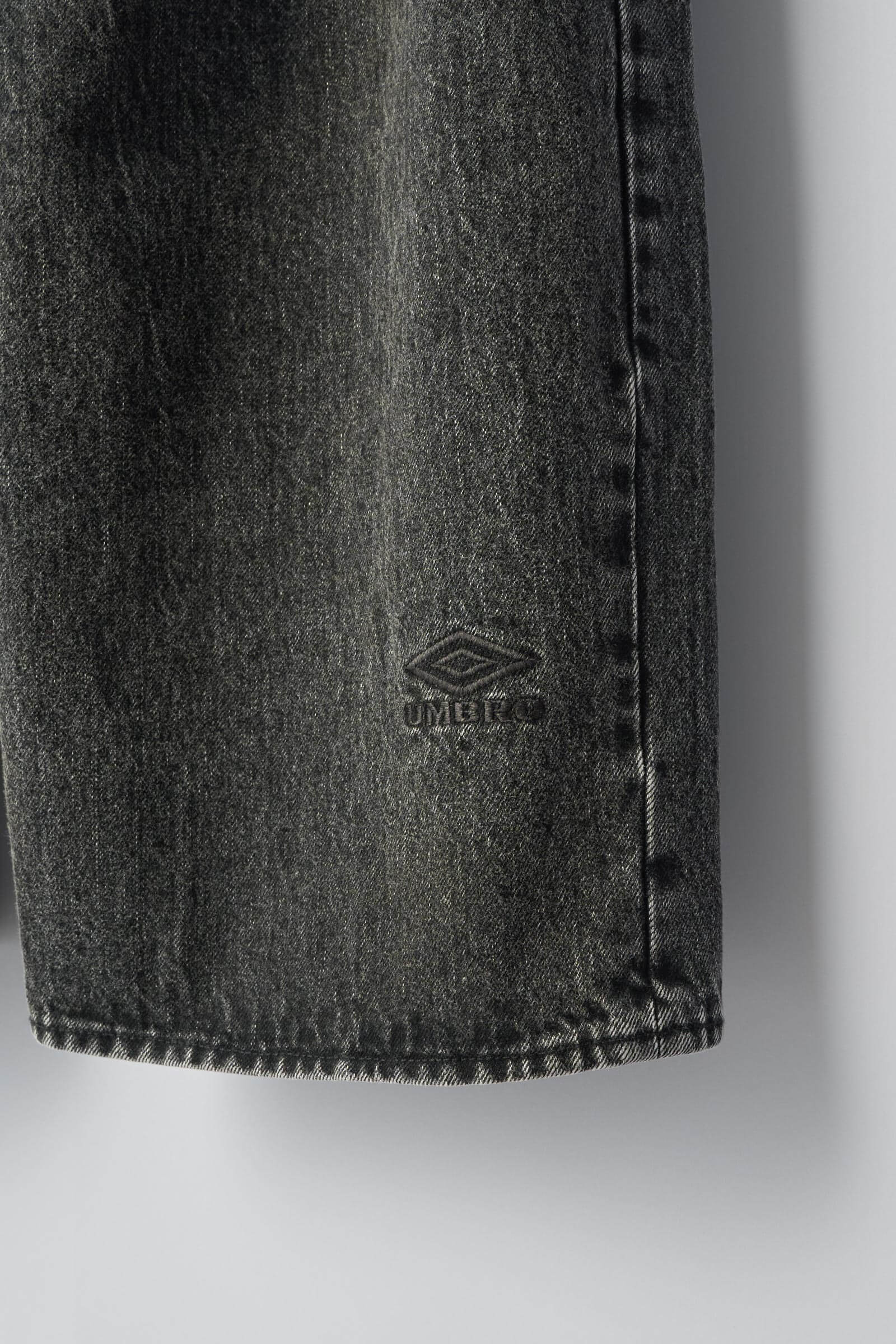 両脇はぎ部分に長めのマチをとり、太もも部分から広がり裾まで落ちるシルエットが特徴的なワイドデニム。生地は13ozの特濃ロープ染色で染めた糸を使用し、旧式力織機でゆっくりと時間をかけて織られたヴィンテージデニム生地を使用。タテ糸のムラ糸はシャープな形状で、エイジングによりリアルな糸落ち感が出るのも特徴。ウエストフロント部分にはレザーパッチ、右足裾後ろ部分にはUMBROのロゴが入る。