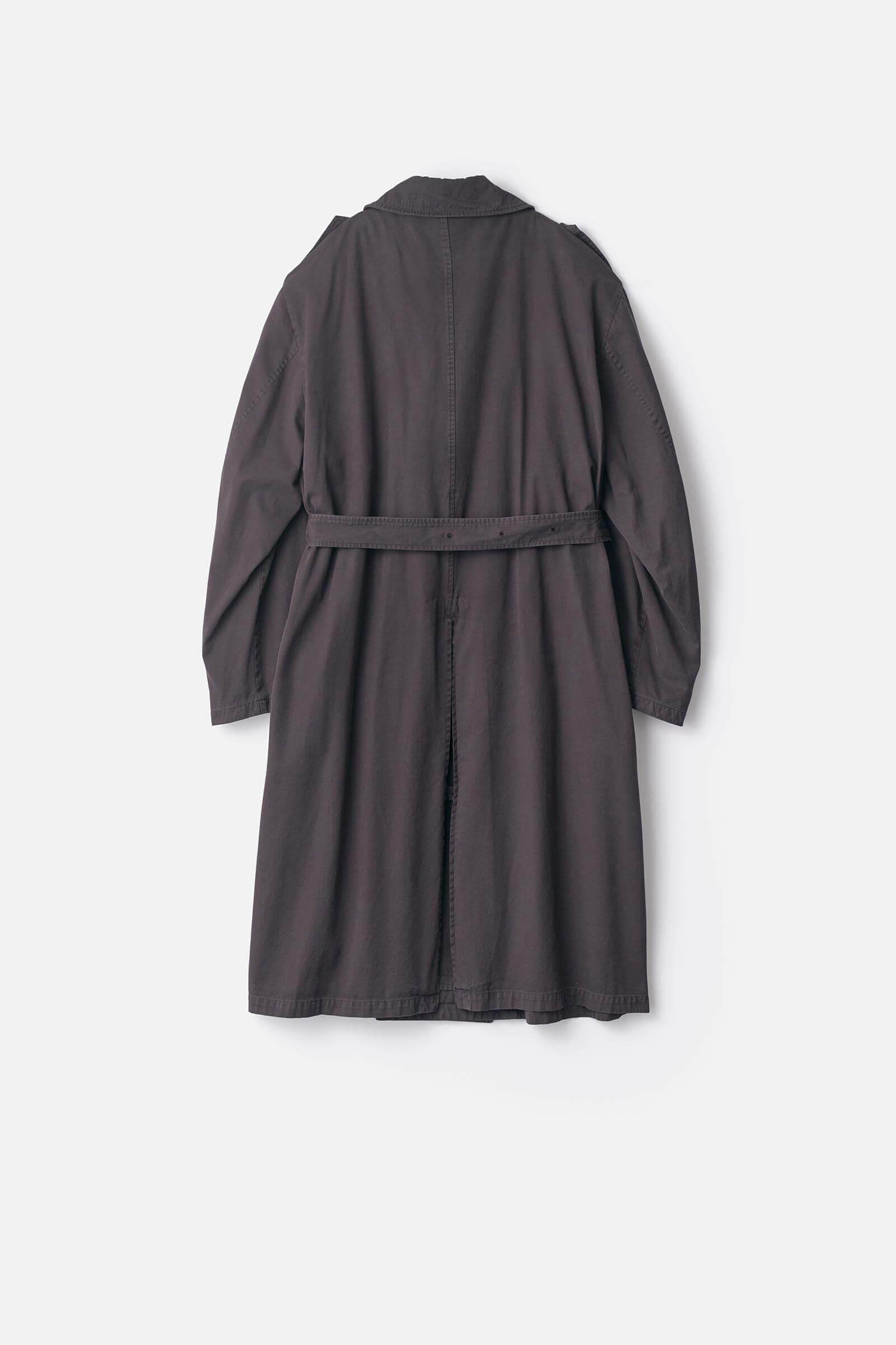 vintageのトレンチコートをベースに、縫製後にボールバイオ、オーバーダイの加工を施し、パッカリング、タマムシの色味にニュアンスを出し、着古したような全体の印象に仕上げています。