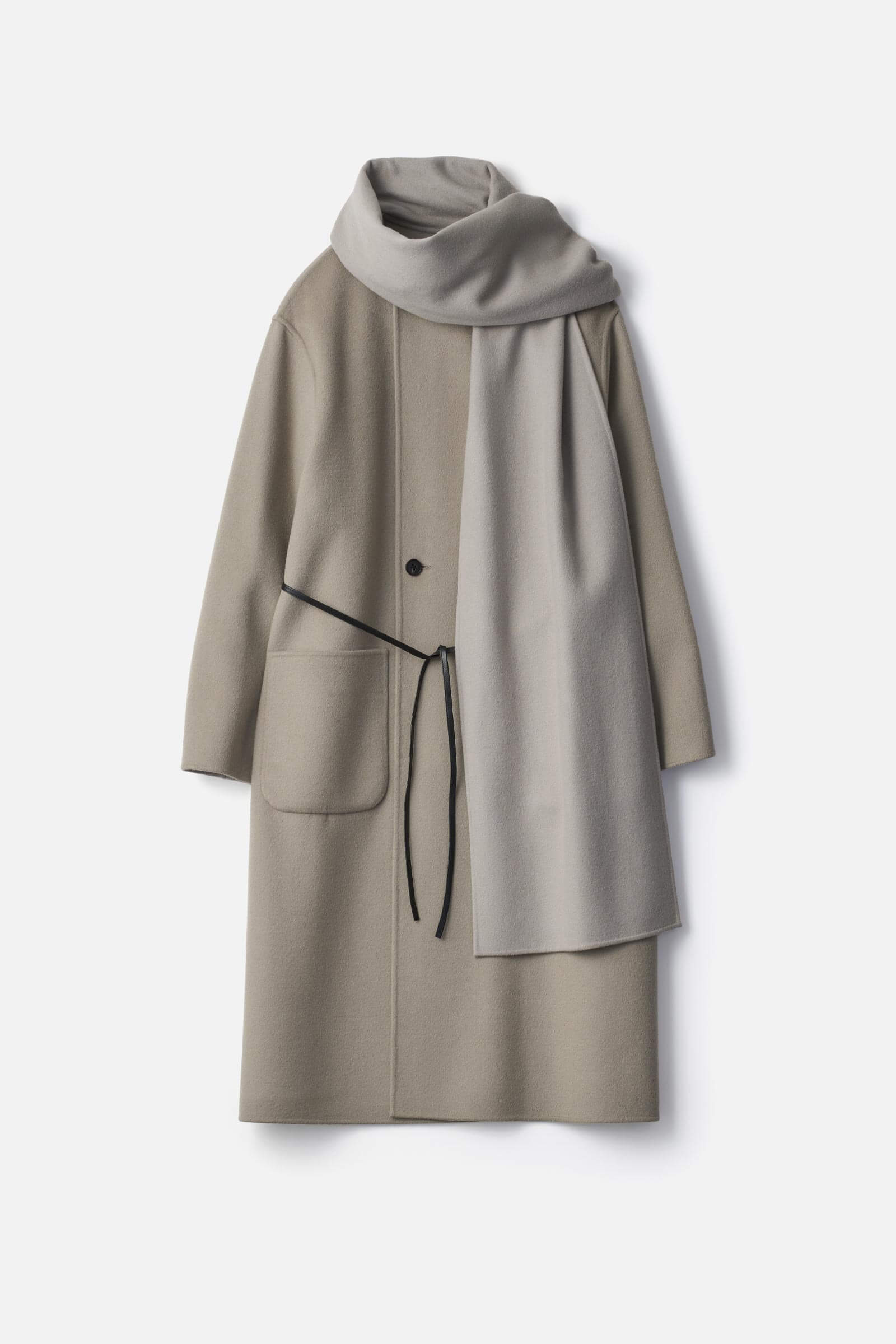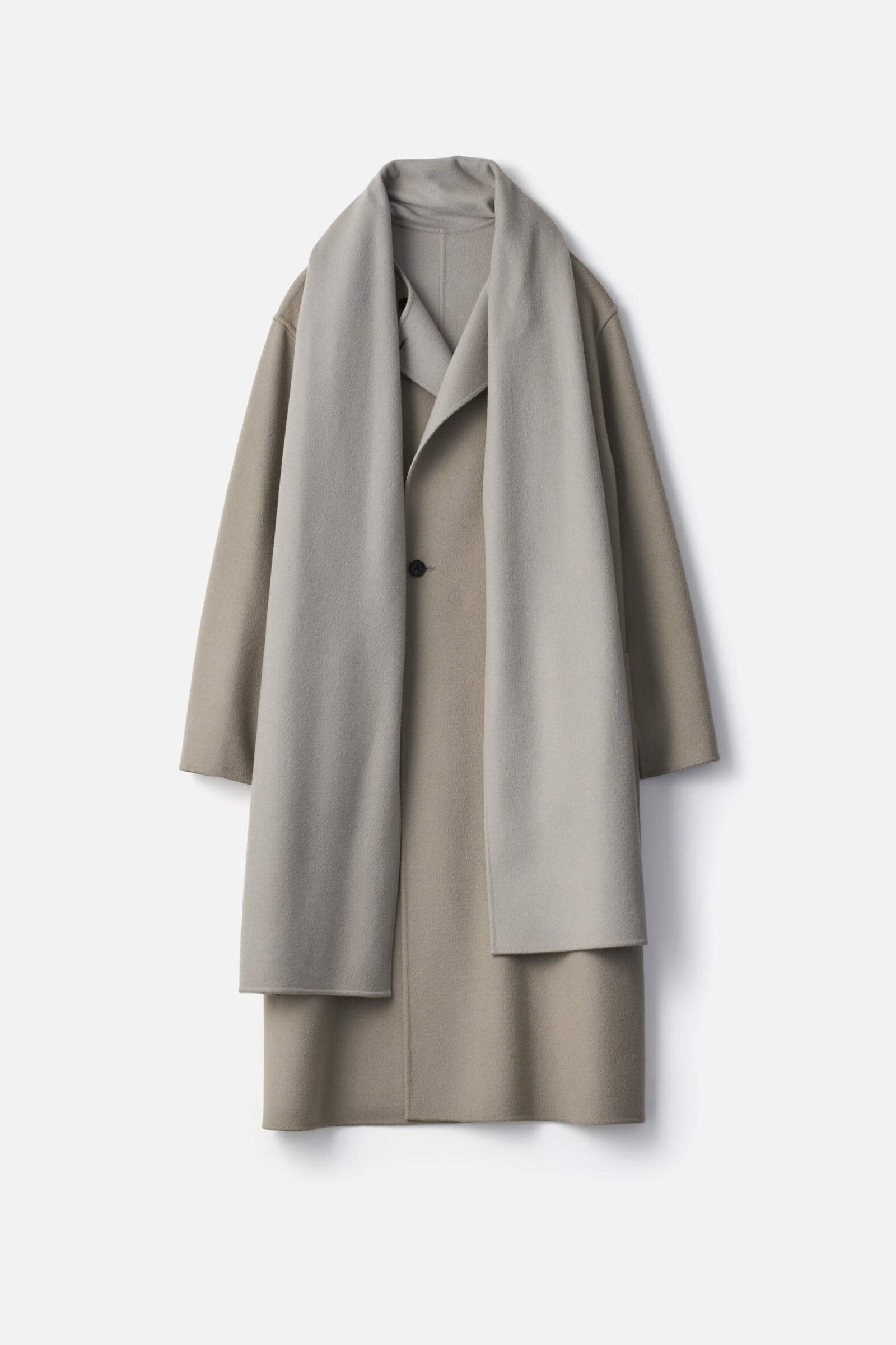 柔らかな風合い、美しい表面の光沢感が特徴のウールカシミヤを接結糸を用いてダブルフェイスに仕上げたビーバー素材を使用したストールコート。