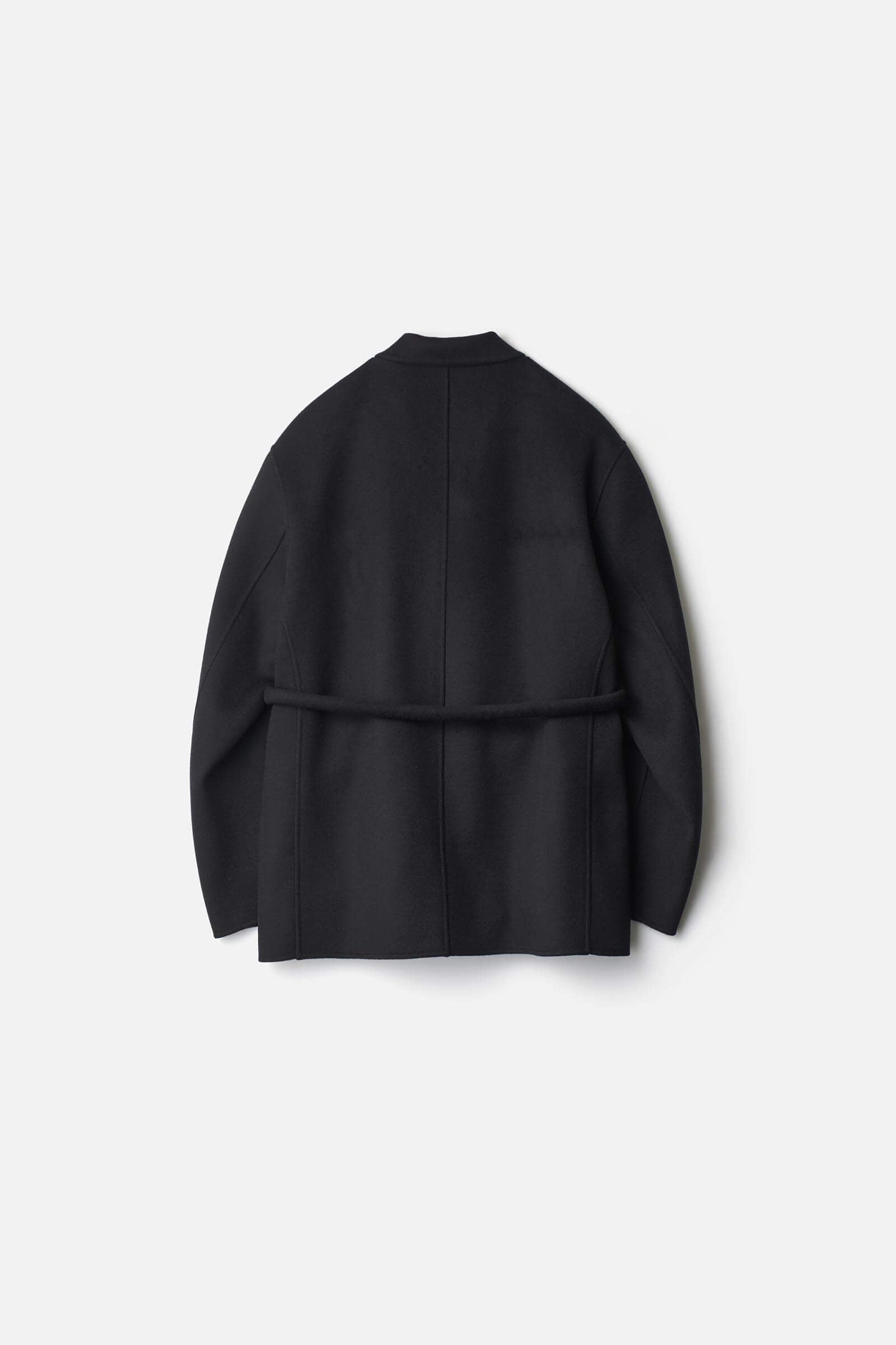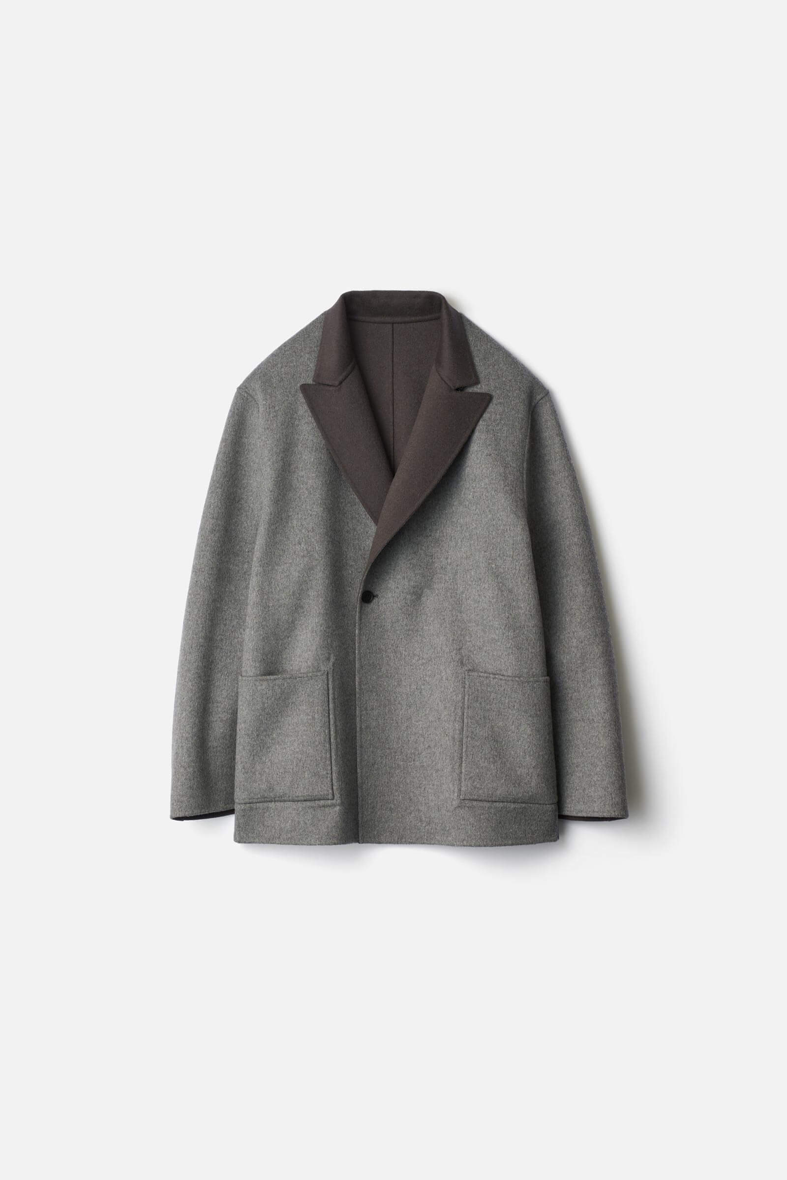 柔らかな風合い、美しい表面の光沢感が特徴のウールカシミヤビーバーを、接結糸を用いてダブルフェイスに仕上げた生地のピークラペルジャケット。